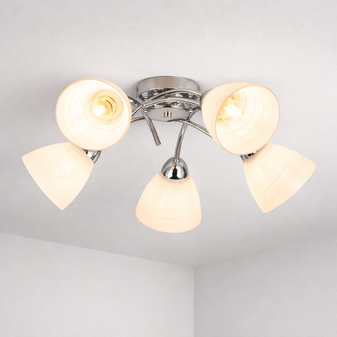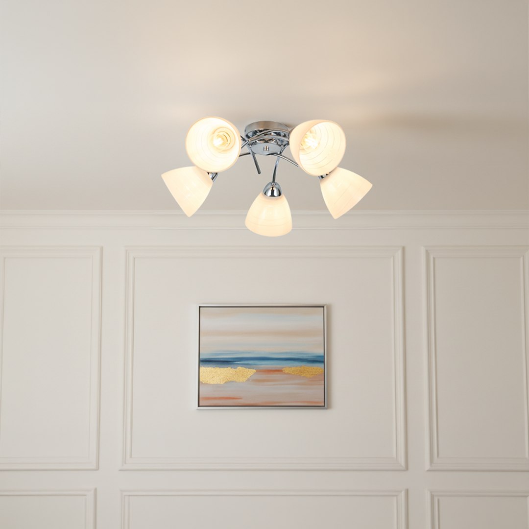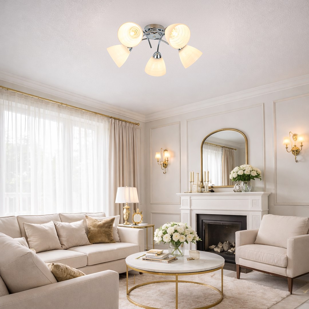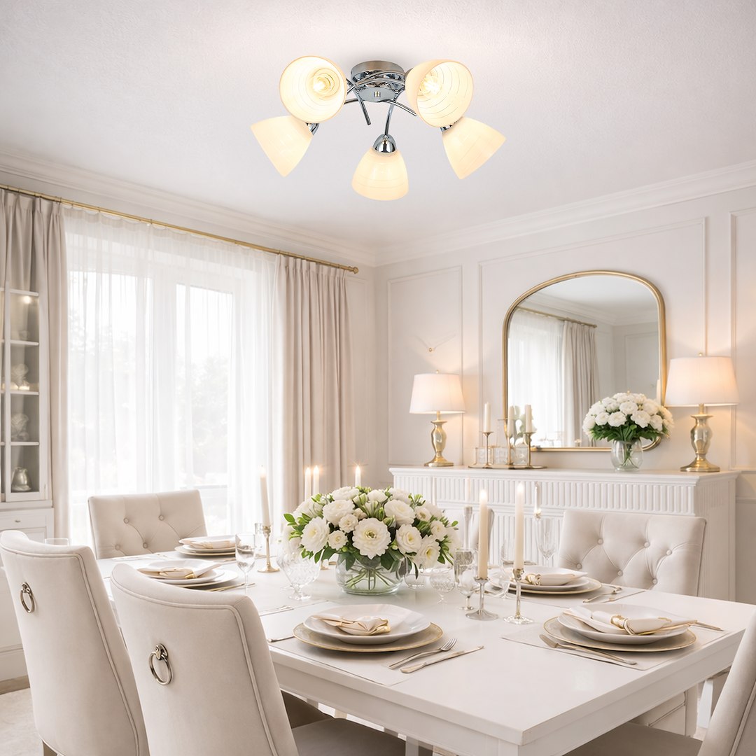 Efektowna forma i ponadczasowy styl Lampa sufitowa CLARA w wersji 5-punktowej to idealne rozwiązanie do większych przestrzeni, gdzie liczy się zarówno estetyka, jak i funkcjonalność. Chromowane wykończenie w połączeniu z białymi kloszami o delikatnym, spiralnym zdobieniu nadaje całości elegancki i nowoczesny charakter. Mocne i równomierne oświetlenie Pięć źródeł światła E27 (żarówki nie są w zestawie) zapewnia intensywne i równomierne oświetlenie pomieszczenia. Mleczne klosze skutecznie rozpraszają światło, tworząc przyjemną, nieoślepiającą atmosferę – idealną do salonu, jadalni czy przestronnego pokoju dziennego. Trwałość i uniwersalne zastosowanie Solidna konstrukcja z metalu i szkła gwarantuje długą żywotność oraz stabilność. Uniwersalny design sprawia, że lampa doskonale wpisuje się w różne aranżacje – od nowoczesnych po bardziej klasyczne wnętrza.