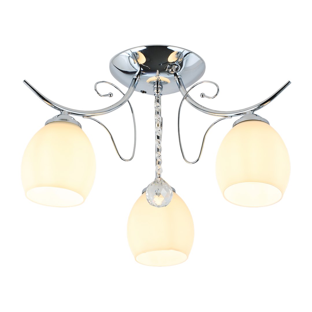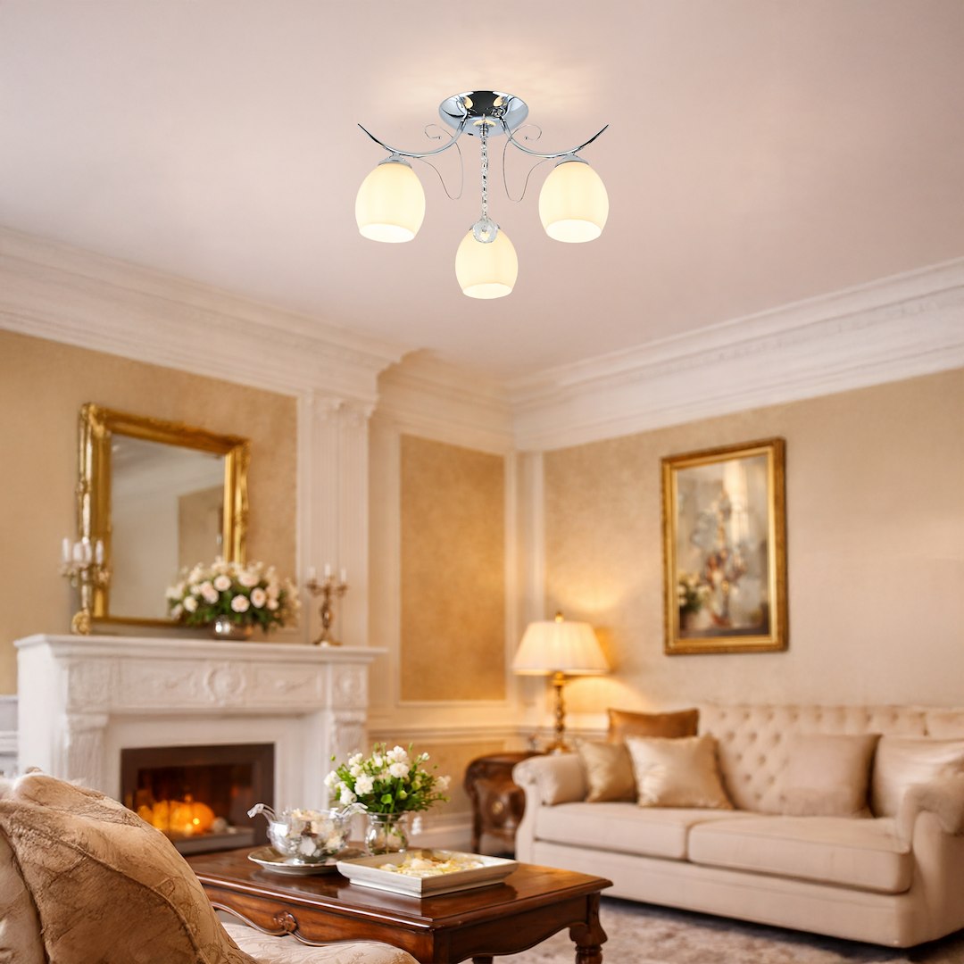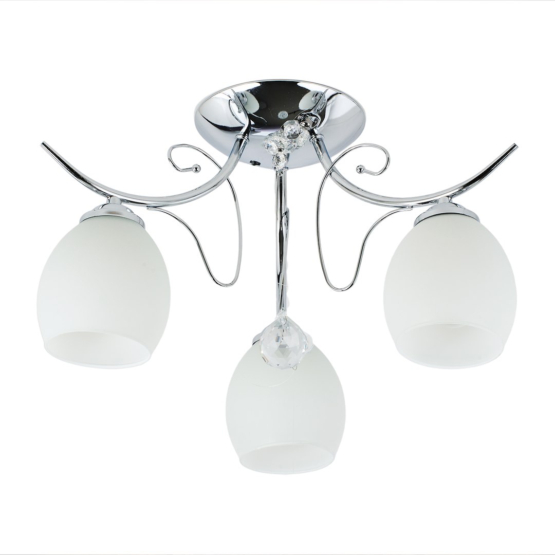 Elegancja z dekoracyjnym akcentem Lampa sufitowa ELLA to stylowa propozycja do wnętrz, w których liczy się subtelna elegancja. Chromowana konstrukcja w połączeniu z delikatnie wyprofilowanymi ramionami oraz ozdobnym, kryształowym elementem nadaje całości lekkości i wyjątkowego charakteru. Przyjemne, rozproszone światło Trzy źródła światła E27 (żarówki nie są w zestawie) zapewniają komfortowe oświetlenie pomieszczenia. Mleczne, szklane klosze równomiernie rozpraszają światło, tworząc przytulną atmosferę idealną do salonu, sypialni czy eleganckiego przedpokoju. Styl i funkcjonalność Wykonana z metalu i szkła lampa łączy trwałość z estetyką. Jej uniwersalny design sprawia, że doskonale wpisuje się w nowoczesne i klasyczne aranżacje, stanowiąc zarówno praktyczne źródło światła, jak i dekoracyjny element wnętrza.