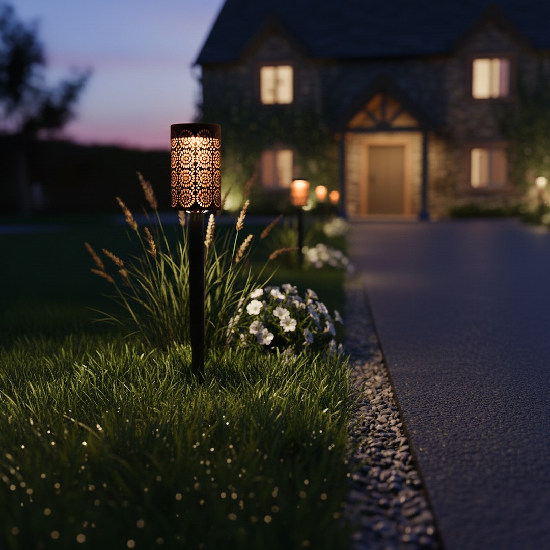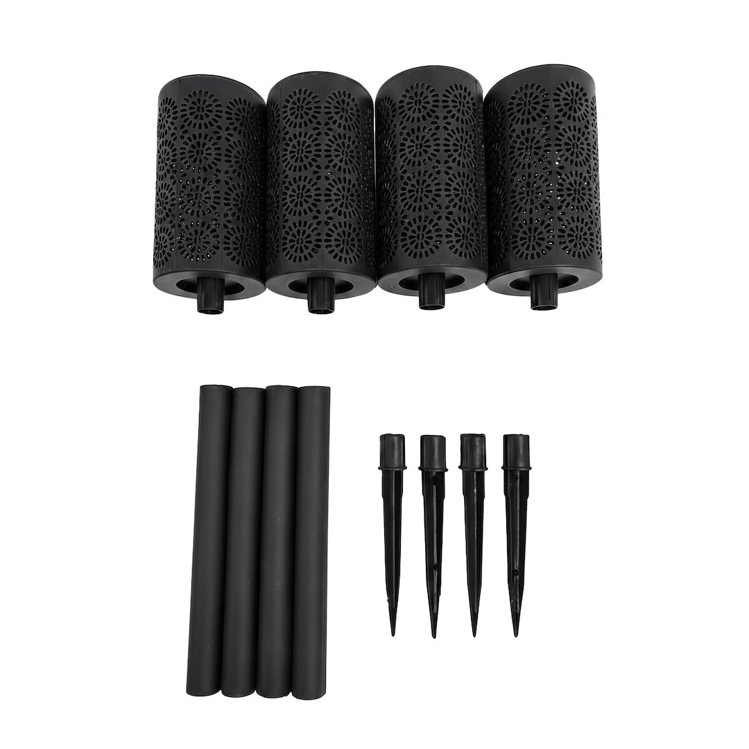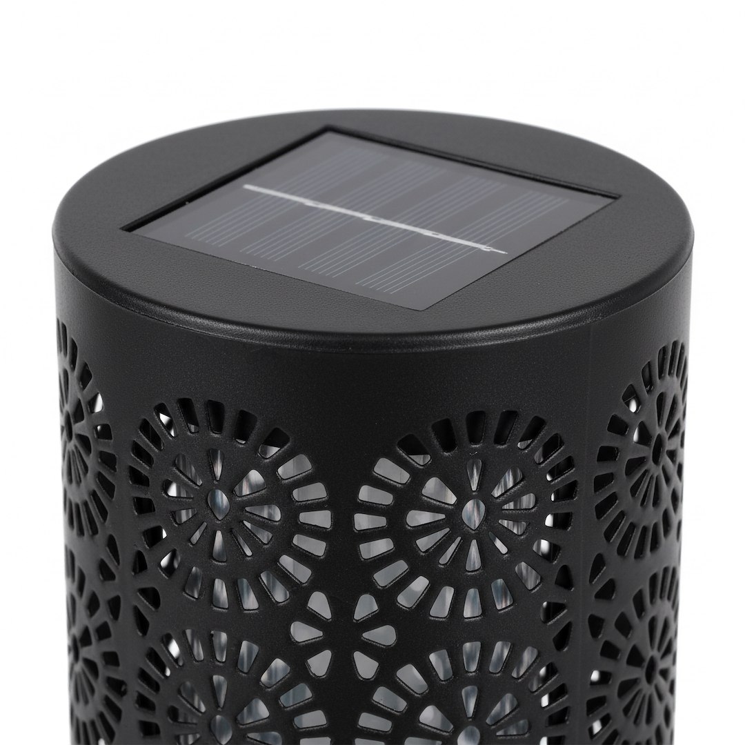 Solarny punkt świetlny w formie zestawu czterech lamp wtykowych przeznaczonych do montażu w gruncie. Zasilanie energią słoneczną upraszcza użytkowanie i eliminuje konieczność prowadzenia instalacji, a wbudowany czujnik zmierzchu automatycznie odpowiada za uruchamianie światła po zapadnięciu zmroku. Każda z lamp ma cylindryczną formę z ażurowym wzorem, który nadaje całości wyraźny, dekoracyjny charakter i wpływa na sposób rozchodzenia się światła. Po zmroku oprawy tworzą rytmiczne, powtarzalne wzory świetlne, które delikatnie rozlewają się po otoczeniu, budując spójną, nastrojową kompozycję. Światło ma miękki, otulający charakter i pełni przede wszystkim funkcję dekoracyjną oraz orientacyjną w przestrzeni. Zestaw czterech punktów świetlnych pozwala na świadome budowanie układu oświetlenia w ogrodzie – wzdłuż ścieżek, przy rabatach, podjazdach oraz w strefach wejściowych. Montaż polega na bezpośrednim wbiciu w grunt, co umożliwia szybkie rozmieszczenie lamp i elastyczne dopasowanie ich ustawienia do aranżacji przestrzeni. Produkt objęty jest standardową gwarancją i wsparciem serwisowym.