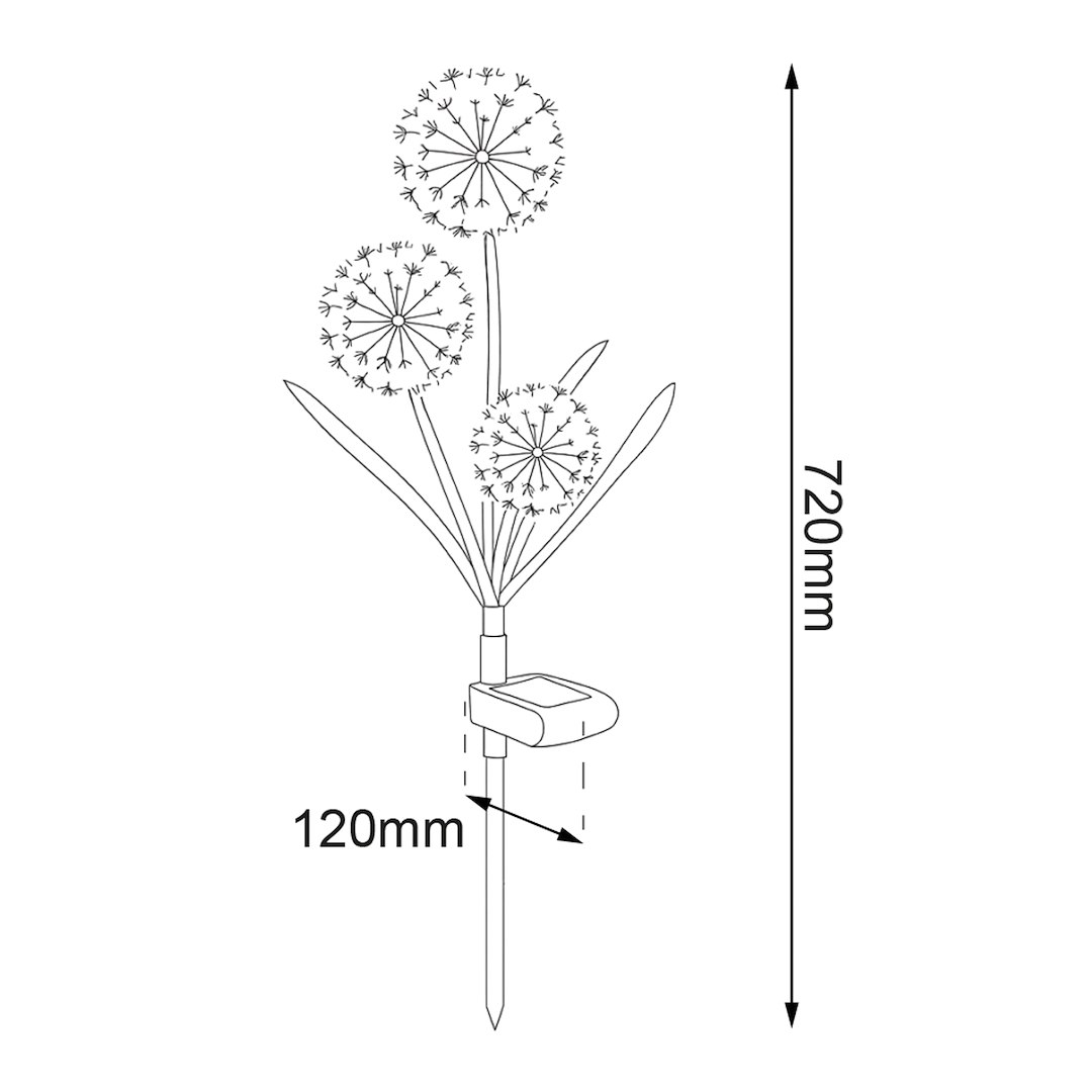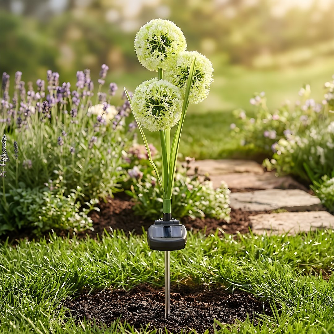 Solarny punkt świetlny w formie lampy wtykowej do montażu w gruncie, inspirowany wyglądem czosnku ozdobnego. Zasilanie energią słoneczną ogranicza zużycie energii elektrycznej, a wbudowany czujnik zmierzchu automatycznie uruchamia oświetlenie po zapadnięciu zmroku. Kuliste, „kwiatowe” formy tworzą subtelny, wielokolorowy efekt świetlny o charakterze dekoracyjnym, który buduje nastrój i stanowi wizualny akcent po zmroku, bez funkcji intensywnego doświetlania przestrzeni. Produkt dobrze sprawdza się w rabatach, wzdłuż ścieżek oraz w strefach wypoczynkowych, gdzie światło pełni przede wszystkim rolę ozdobną. Smukła konstrukcja z elementami przypominającymi łodygi i liście sprawia, że lampa naturalnie wpisuje się w otoczenie roślinności i nie dominuje aranżacji. Montaż polega na wbiciu w grunt, co umożliwia szybkie i elastyczne rozmieszczenie bez konieczności prowadzenia instalacji. Produkt objęty jest standardową gwarancją i wsparciem serwisowym.