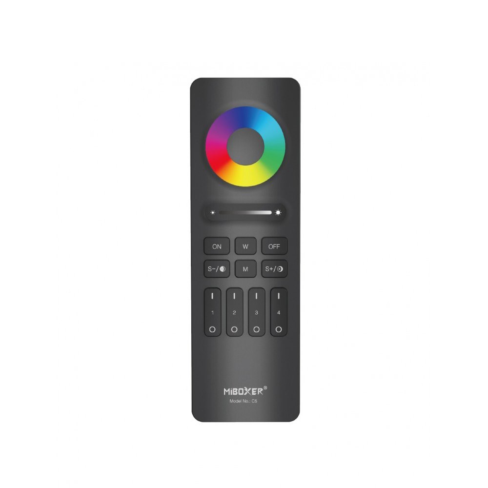 Pilot Milight C5 pozwala na regulację jasności, temperatury oraz regulację koloru z palety RGB. Regulacji jasności dokonujemy za pomocą suwaka, a zmiany koloru poprzez przesunięcie palcem po kole RGB. Dzięki pilotowi C5 oraz dedykowanym sterownikom możemy podzielić oświetlenie na strefy. Można nimi sterować niezależnie lub dzięki synchronizacji sterowników kontrolować oświetlenie we wszystkich strefach jednocześnie. W zestawie uchwyt magnetyczny do przechowywania pilota.