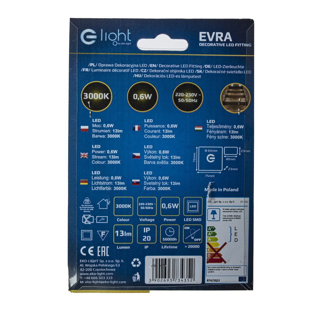 Oprawy Schodowe Eko-Light to wysokiej jakości oprawa LED o charakterze dekoracyjno-użytkowym. Znajduje zastosowanie przy oświetlaniu korytarzy, ciągów schodowych, dekoracyjnym podświetlaniu mebli oraz tworzeniu aranżacji świetlnych w architekturze wnętrz. Oprawa montowana do puszki instalacyjnej O60 bezposrednio na 230V.