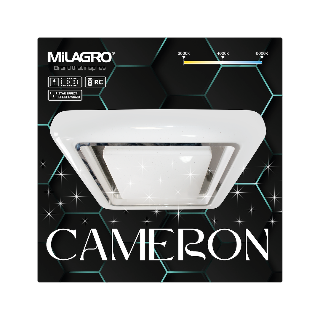 Lampa CAMERON polskiej marki MiLAGRO prezentują wszystko to, czego wymaga się od nowoczesnego oświetlenia sufitowego: zapewniają optymalny poziom jasności, przyciągają wzrok znakomitym designem, a do tego łatwo można nimi sterować przy pomocy pilota.