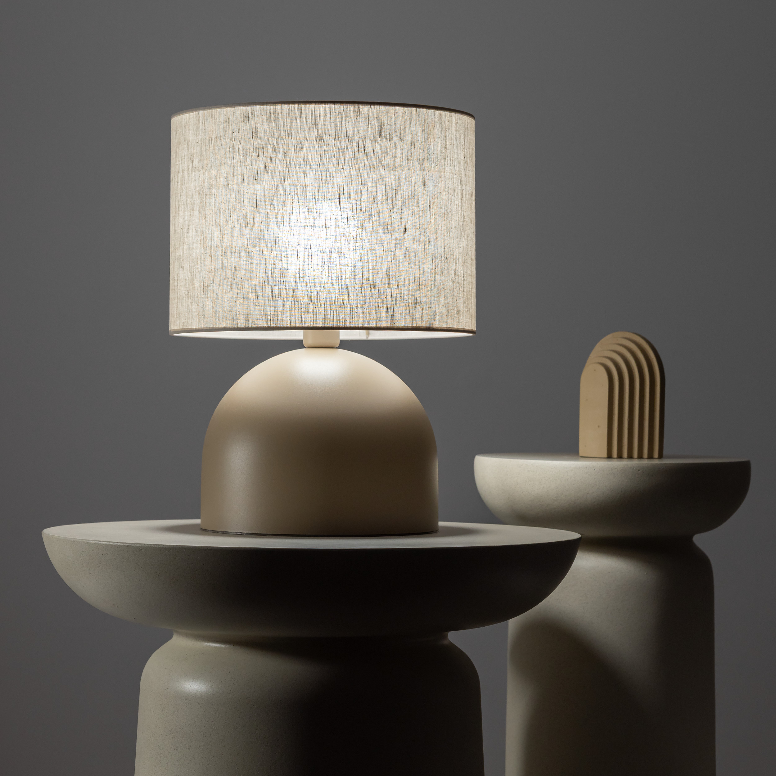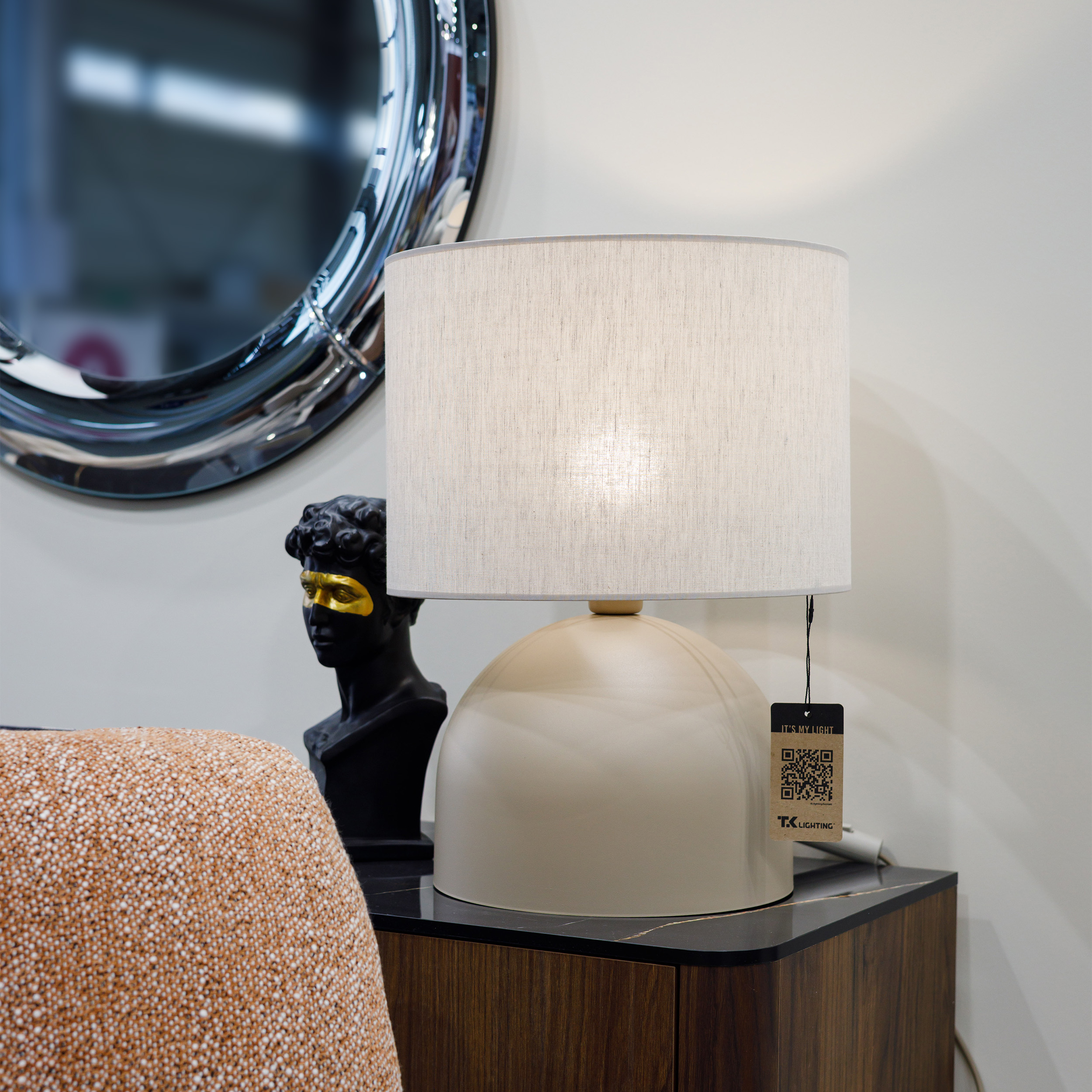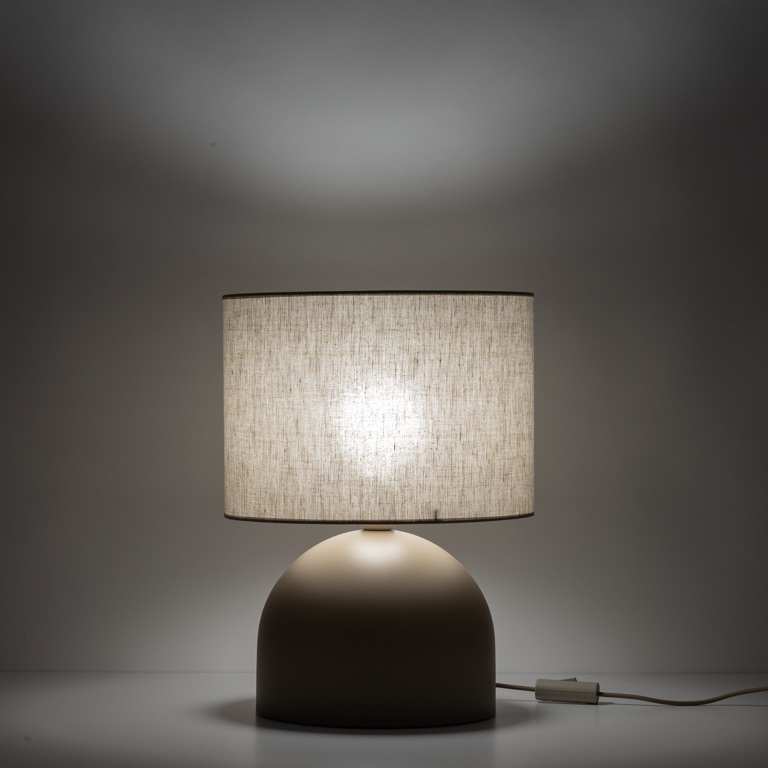 TAMI to rodzina nowoczesnych lampek stołowych, które łączą prostą formę z wyjątkowo przytulnym charakterem. Półokrągła, metalowa podstawa o matowym wykończeniu i miękkiej linii tworzy stabilną bazę dla klasycznego, cylindrycznego abażuru z tkaniny. Zestawienie gładkiej kopuły z teksturą materiału daje elegancki, ale nienachalny efekt, idealny do codziennych, domowych aranżacji. Lampki dostępne są w dwóch stonowanych wersjach kolorystycznych – ciepłym beżu oraz chłodniejszym odcieniu brązu. Dzięki czemu łatwo dopasujesz je zarówno do wnętrz skandynawskich, minimalistycznych, jak i bardziej klasycznych.